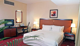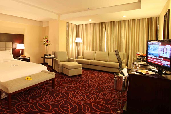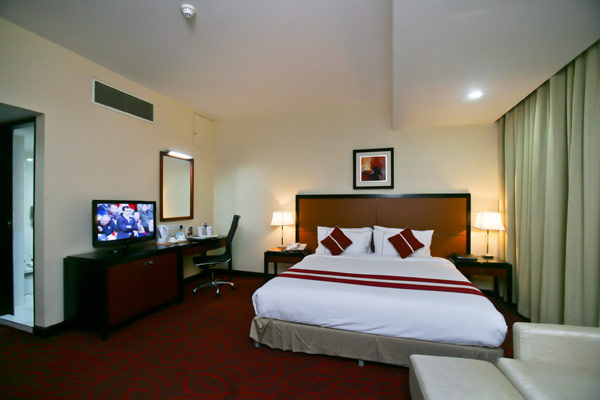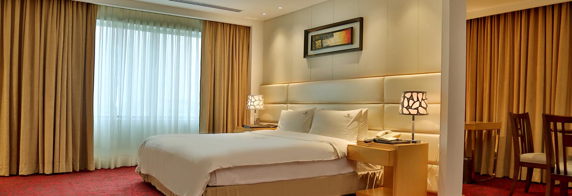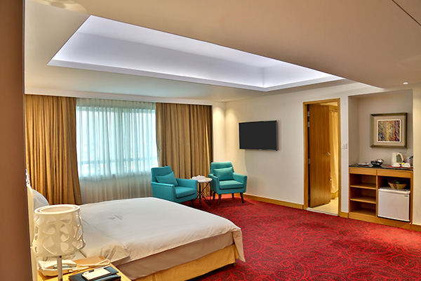 This elegant yet minimally furnished guest room of over 600 sq. ft. allows plenty of breathing room with a king size bed, small sitting area and dining space. You will also get to enjoy an unobstructed view of Hazrat Shahjalal International Airport runway.